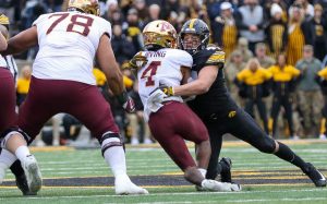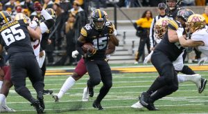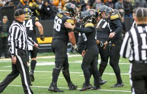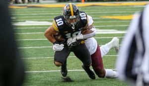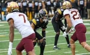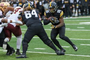 Iowa linebacker Jack Campbell takes a drink during warmups before a game against Minnesota on Nov. 13, 2021 at Kinnick Stadium in Iowa City, Iowa. (Rob Howe/HawkFanatic.com)The Iowa Football team comes down the tunnel before a game against Minnesota on Nov. 13, 2021 at Kinnick Stadium in Iowa City, Iowa. (Rob Howe/HawkFanatic.com)Iowa coach Kirk Ferentz looks out onto the field before a game against Minnesota on Nov. 13, 2021 at Kinnick Stadium in Iowa City, Iowa. (Rob Howe/HawkFanatic.com)Iowa players line up as they prepare to swarm before a game against Minnesota on Nov. 13, 2021 at Kinnick Stadium in Iowa City, Iowa. (Rob Howe/HawkFanatic.com)Iowa safety Dane Belton (4) lines up between a pair of Minnesota receivers during their game on Nov. 13, 2021 at Kinnick Stadium in Iowa City, Iowa. (Rob Howe/HawkFanatic.com)Iowa running back Tyler Goodson (15) carries the ball during a game against Minnesota on Nov. 13, 2021 at Kinnick Stadium in Iowa City, Iowa. (Rob Howe/HawkFanatic.com)Iowa center Tyler Linderbaum (65) makes a call at the line during a game against Minnesota on Nov. 13, 2021 at Kinnick Stadium in Iowa City, Iowa. (Rob Howe/HawkFanatic.com)Iowa tight end Sam LaPorta (84) runs after a catch as Minnesota linebacker Braelen Oliver makes a tackle during their game on Nov. 13, 2021 at Kinnick Stadium in Iowa City, Iowa. (Rob Howe/HawkFanatic.com)Iowa quarterback Alex Padilla (8) enters the huddle during a game against Minnesota on Nov. 13, 2021 at Kinnick Stadium in Iowa City, Iowa. (Rob Howe/HawkFanatic.com)Iowa quarterback Alex Padilla (8) rolls out against Minnesota during their game on Nov. 13, 2021 at Kinnick Stadium in Iowa City, Iowa. (Rob Howe/HawkFanatic.com)Iowa receiver Arland Bruce (10) is tackled by a Minnesota defender during their game on Nov. 13, 2021 at Kinnick Stadium in Iowa City, Iowa. (Rob Howe/HawkFanatic.com)Iowa coach Kirk Ferentz walks the sidelines during a game against Minnesota on Nov. 13, 2021 at Kinnick Stadium in Iowa City, Iowa. (Rob Howe/HawkFanatic.com)Iowa defensive lineman Zach VanValkenburg (97) chases Minnesota running back Mar’Keise Irving (4) during their game on Nov. 13, 2021 at Kinnick Stadium in Iowa City, Iowa. (Rob Howe/HawkFanatic.com)Iowa linebacker Seth Benson (44) tackles Minnesota running back Mar’Keise Irving during their game on Nov. 13, 2021 at Kinnick Stadium in Iowa City, Iowa. (Rob Howe/HawkFanatic.com)Iowa receiver Tyrone Tracy Jr. (3) runs a reverse against Minnesota during their game on Nov. 13, 2021 at Kinnick Stadium in Iowa City, Iowa. (Rob Howe/HawkFanatic.com)Iowa lineman Nick DeJong congratulates kicker Caleb Shudak (10) after an extra point against Minnesota during their game on Nov. 13, 2021 at Kinnick Stadium in Iowa City, Iowa. (Rob Howe/HawkFanatic.com)Iowa’s Dane Belton (4) and Matt Hankins (8) pursue Minnesota running back Mar’Keise Irving during their game on Nov. 13, 2021 at Kinnick Stadium in Iowa City, Iowa. (Rob Howe/HawkFanatic.com)Iowa’s Kaevon Merriweather (26) and Dane Belton (4) tackle Minnesota receiver Daniel Jackson(9) during their game on Nov. 13, 2021 at Kinnick Stadium in Iowa City, Iowa. (Rob Howe/HawkFanatic.com)Minnesota running back Ky Thomas (8) carries the ball against Iowa during their game on Nov. 13, 2021 at Kinnick Stadium in Iowa City, Iowa. (Rob Howe/HawkFanatic.com)Iowa running back Tyler Goodson (15) looks for a hole while teammate Kyler Schott (64) blocks against Minnesota during their game on Nov. 13, 2021 at Kinnick Stadium in Iowa City, Iowa. (Rob Howe/HawkFanatic.com)Iowa receiver Charlie Jones (16) lays out for a catch in front of coverage from Minnesota’s Justin Walley during their game on Nov. 13, 2021 at Kinnick Stadium on Iowa City, Iowa. (Rob Howe/HawkFanatic.com)