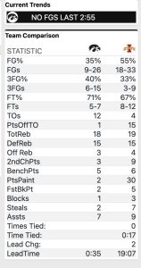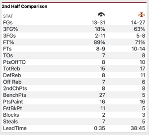 The Hawkeyes failed to score their first basket inside the three point line until the 10:46 mark in the first half. While the Cyclones put up 12 points in the paint during that same time.