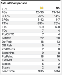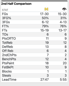 2nd half: The run Iowa needed did not come at the begging of the half as the Hawkeyes had to call a timeout just three and a half minutes into the half during the middle of a 11-0 Wolverine run. In that span Iowa missed four straight shots with their starting unit.