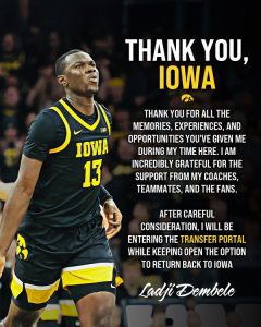 IOWA CITY, Iowa – Sophomore forward Ladji Dembele plans to enter the transfer portal, making him the seventh Iowa player to enter the portal since Fran McCaffery was fired as the Iowa head coach last Friday.